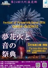 自然豊かな大町温泉郷で、2月の毎週土曜に「夢花火と音の祭典」が開催されます。澄みきった冬の空に、スターマインをはじめとした花火が打ち上げられ、和太鼓と共演する迫力ある音が響き渡ります。2026年で大町温泉郷が60周年を迎えることを記念し、地元酒蔵による振る舞い酒が行われるほか、メッセージキャンドルに参加すると記念タオルがプレゼントされます(先着60人)。