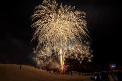 巨大な氷柱(つららの塊)へと姿を変えた平湯大滝が、ライトアップされます。飛騨の三大名瀑である平湯大滝の荘厳な姿が、この時期ならではの神秘的な光景に包まれます。イベント期間内には、打ち上げ花火も実施されます。