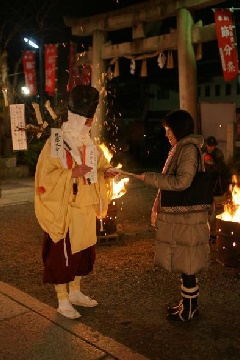 須賀神社で節分祭が斎行され、武道の演舞奉納や、追儺招福豆まきが行われます。両日とも、烏帽子に水干(すいかん)姿で肩に梅の枝を担いだ“懸想文(けそうぶみ)売り”による、縁結びのお守り「懸想文」(有料)の授与があります。懸想文は、鏡台やタンスの中に入れておくとより美人になる、良縁を得られるとされ、古くから人気があります。