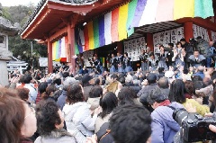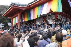 一年の無病息災、家内安全を祈る行事として、西國寺で節分会が行われます。その年の干支に生まれた袴姿の人びとにより、「鬼は外、福は内」のかけ声とともに炒った大豆がまかれます。豆のほか、餅やくじも投げられます。