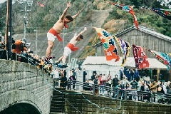「水中綱引き」は美浜町の日向地区に伝わる神事で、三方五湖のひとつ日向湖と日本海を結ぶ日向運河で行われます。その昔、この運河に大蛇が現れて川をふさぎ、漁に出られなくなったとき、大綱をつくって川に渡したところ、大蛇が自分よりも大きな蛇だと勘違いし、退散したという伝説にちなむ行事です。地元の青年達が豊漁を願って川に飛び込み、東西にわかれて綱を引きちぎります。20分程でどちらか一方の綱が切れると、海の神に捧げるため、綱は外海に流されます。