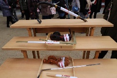 営繕の作業が計画通り、滞りなく無事に実施されることを祈念し、太宰府天満宮では、年の初めに宮大工の棟梁をはじめ関係者によって「斧始祭」が執り行われます。長さ3mの神木が、斎場に据えられ、お祓いの後に、大工により曲尺(かねじゃく)と墨壺を使って線を引く「墨立ての儀」が行われます。烏帽子直垂姿の棟梁が、神木の両端と中央に「えいっ」という掛け声とともに神宝の斧を打ち込み、その年の営繕の無事を祈ります。この神事は、康和3年(1101年)に大宰権帥、大江匡房(おおえまさふさ)卿によって始められたとされます。