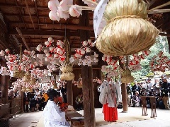 相楽地区では2月1日を「ニノショウガツ」と呼び、神社に餅花が奉納されます。紅白の紙を付けた真っ白な餅の花が拝殿いっぱいに飾られ、昼過ぎに餅花を飾った拝殿の中で神楽が納められます。御田や餅花などの相楽神社の正月行事一連は、京都府の無形民俗文化財に指定されています。