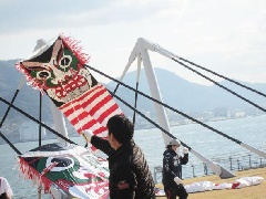 「馬関名物たこあげ大会」は亀山八幡宮の節分行事の一つで、明治頃まで下関各地で盛んに行われていた凧あげ大会を後世に伝えようと始まりました。海峡の空に大小さまざまな手作り凧が乱舞し、関門地方に春を告げる行事として親しまれています。なかでも畳10枚分の大きさがある「鬼ようず」(萩・見島の伝統凧)や、ふぐの顔をデザインした「ふく凧」の連凧などが見物です。境内では鬼の舞のほか、年男年女による豆まき式(もちまき)なども行われます。大会に先立ち、1月25日(13:00~16:00)には、凧作り教室も実施されます。