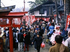 鼻顔稲荷神社で斎行される初午祭には、ダルマ店などの露店が並び、県内外からの参拝客をはじめ合格祈願の親子連れで賑わいます。社殿の下を流れる湯川河川敷では、役目を終えた古ダルマの「奉焼祭」が行われます。