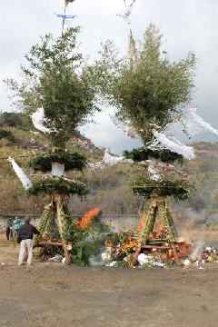400年以上の伝統を誇る新春の火祭り「上関神明祭(かみのせきしんめいさい)」が、上関町の沖の浜埋立地で開催されます。この祭りは、小早川隆景が御神体を作らせて軍神を祀り、戦勝祈願したのが始まりとされ、慶長9年(1604年)に、小早川家の重臣浦景継が上関の領主として着任した頃から、無病息災を祈り、毎年行われるようになりました。神楽奉納の後、竹や松で作られた、高さ約12mの2体の御神体に点火されます。炎が勢いよく燃え上がる様子は迫力満点です。豚汁のふるまい、餅まきなどもあります。