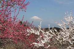 高台にあり、富士市を一望できる岩本山公園には、ブンゴ、シラカガ、ジュウロウ、メオトコウバイなど約30種類、400本の梅が植栽されており、例年2月上旬から3月上旬にかけてが花の最盛期となります。品種により見頃が異なるため、3月下旬までの長い期間、花見を楽しむことができるのが魅力です。天気に恵まれた日には、富士山を背景に白や紅の梅が咲き誇る様子が素晴らしく、「富士山と梅」の撮影ポイントとしても有名です。桜をはじめ、ツツジやシャクナゲの名所としても知られます。