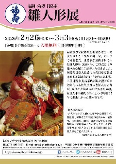 神戸酒心館ホールで早春恒例となっている雛人形展が開催されます。かつて筑豊の炭鉱業で大成し、「筑豊の御三家」のひとつと称された名家、貝島家から寄贈された雛人形が飾られます。この雛人形は、高宮貝島本家の三代目当主である貝島孝が、長女の禮子の初節句にあたり誂えたもので、十五人揃いの絢爛な雛飾りとなっています。京都の老舗人形店として知られる丸屋(現・丸平大木人形店)の五世、大木平藏の作であり、伝統技術の粋が詰まった逸品です。