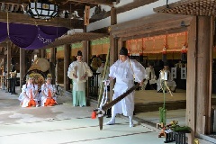 大神神社で、年の初めに穀物の豊穣を祈る、古式のお田植祭が執り行われます。拝殿向拝を「神田」に見立て、田作男(たつくりおとこ)役が木型の牛や鍬などを使い、おもしろおかしく農耕の所作を行います。神前に供えた「籾種(もみだね)」が、田作男によってまかれ、早乙女が早苗として苗松を持ち、お田植の所作を行うなど、見どころが続きます。
