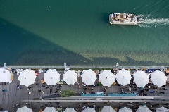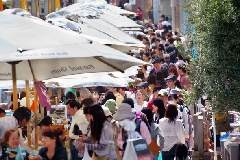 徳島県最大級の産直市「とくしまマルシェ」が、しんまちボードウォーク周辺に約80本の白いパラソルが軒を連ね、毎月最終日曜に開催されます。とくしまマルシェ事務局スタッフが直接足を運び、徳島県内のおいしい食材を探し、出店交渉を行う逆指名スタイルで、その選び抜かれた生産者がそれぞれ自慢のこだわりの逸品を、来場者との会話を大切にしつつ対面販売を行っています。新鮮な農産物、肉、魚などの生鮮品をはじめ、スイーツやカフェ、ハンドメイドなど、さまざまなお店が並びます。豊かな自然に恵まれた「関西の食の台所とくしま」の逸品を求めて、大勢の人で賑わいます。