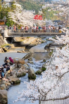 玉造温泉街には、玉湯川を挟んで両側に旅館や店舗があり、春になるとおよそ400本のソメイヨシノが咲き誇ります。桜の見頃に合わせて開催される「桜まつり」では、期間中、ライトアップに加え、キッズ夜店(子ども縁日)、しまねの地酒まつりが行われます。怪談の影絵も登場するなど、夜の玉造温泉街の散策をゆっくりと楽しむことができます。