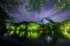 九州の名勝として名高い国登録記念物の御船山楽園で「花まつり」が開催されます。園内にはソメイヨシノ、オオシマザクラ、ヤエザクラなどがあり、とくに入門ゲート前に広がる池の周辺と、御船山の断崖下「つつじ谷」の左側に群生している桜が格別の美しさを見せます。そのほか約20万本のツツジや、推定樹齢170年の大藤などの花々が、バトンを受け継ぐように次々と咲き誇ります。見頃はそれぞれ例年、桜が3月下旬から4月上旬、ツツジが4月中旬から下旬、大藤が4月下旬から5月上旬となっています。九州最大級の夜桜ライトアップが行われ、5万坪エリアの2000本の桜が闇夜に浮かび上がります。