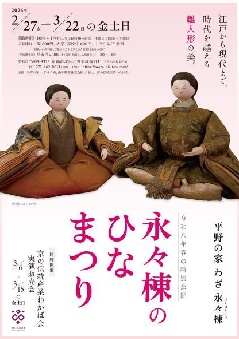 大正15年(1926年)に、日本画家、山下竹斎の邸宅兼アトリエとして建てられた伝統的木造家屋を、数寄屋大工の手により改修した「平野の家 わざ 永々棟」で、春の訪れにあわせて、お雛様が公開されます。大正時代の雰囲気が残る数寄屋建築の座敷に、永々棟所蔵の享保雛、古今雛、有職雛、次郎左衛門雛といった、江戸時代から現代までのさまざまな雛人形が飾られるほか、精巧に作られた雛調度、愛らしい市松人形や西洋人形なども展示されます。京の次代を担う若手職人「京の伝統産業わかば会」による実演販売会も催されます(3月6日~15日の金土日曜)。