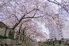 旧福岡県庁跡地にあり、広大な芝生広場や国指定重要文化財「貴賓館」などを有する天神中央公園は、花見の名所として知られています。薬院新川沿いのさくら広場に、ソメイヨシノやヤマザクラ、サトザクラなど約50本が植栽されており、例年3月下旬から4月上旬にかけて見頃を迎え、最盛期には川沿いに桜のトンネルが出現します。夜にはさくら並木などがライトアップされ、幻想的な夜桜が観賞できます。