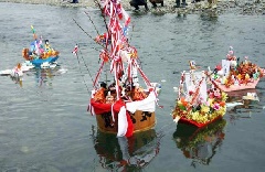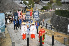 粉河に早春を招く「紀の川流し雛」が開催されます。粉河寺境内の特設祭壇に、子どもや市民がそれぞれの願いをこめた紙雛を奉納し、子どもの健やかな成長と市民の安全と幸せを願う祈願祭が行われます。その後、「お姫さま」を先頭とした大行列が寺を出発し、とんまか通りから紀の里農協粉河支所前の中津川川原までを華やかに練り歩きます。川原に到着した「紙雛」は、子どもたちや市民の手により、優しく中津川に流されます。