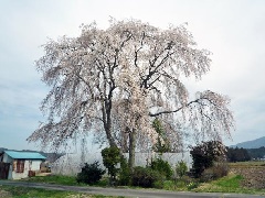 岩村町の史跡「吉田川経塚」には大きなシダレザクラが1本あり、例年3月下旬から4月上旬にかけて見頃を迎えます。農村景観日本一とされる地区で、あたりに高い建物などがなく、のびのびとその枝を大空へ向けて伸ばしています。