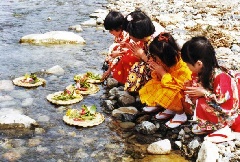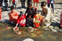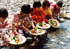 鳥取県用瀬(もちがせ)町では、旧暦の3月3日に流しびなが行われ、男女一対の紙雛を桟俵にのせ、菱餅や桃の小枝を添えて川に流します。一年間、無病息災で幸せに生活できるようにと願う情緒豊かな民俗行事です。茶席なども設けられ、ひな飾り通りは、大勢の観光客で賑わいます。