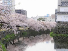 大分の市街地の中心にある大分城址公園では、例年3月下旬になるとソメイヨシノ約65本が満開となります。外堀に沿って桜が咲き、水面に映る桜や、櫓や石垣を背景に咲く桜の美しい景観を醸します。