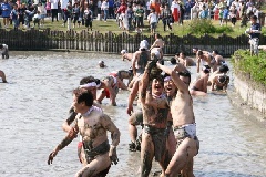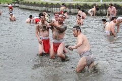 印鑰神社(いんにゃくじんじゃ)で毎年4月29日に行われる春季大祭では、「鮒取神事」が見どころとなっています。その昔、石川宿祢がこの地を訪れた際(旧正月)、若者たちが氷の張った鏡ヶ池に裸で飛び込み、鮒を手取りにして御前に供した故事にならい、受け継がれている伝統行事です。お神酒で清めた締め込み姿の若者数十人が投げつける、鮒や泥が当たると、その年は無病息災でいられるとされます。