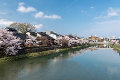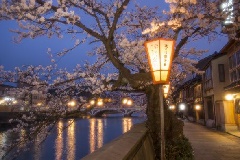 主計町(かずえまち)茶屋街の浅野川沿いには桜が植えられており、春になると、昔ながらの料亭や茶屋が建つ街並みに一層の情緒を醸し出します。夜にはガス灯がともり、昼とは一味違う趣が楽しめます。
