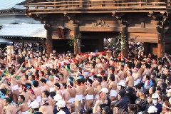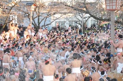 尾張大國霊神社(国府宮)で、旧暦1月13日に、通称「はだか祭」と呼ばれる儺追神事が行われます。数千人のはだか男らが「神男」に触れようと、肉弾相打つ揉み合いが繰り広げられます。はだか祭の前日に50俵の大鏡餅がお供えされ、祭の翌日は、大鏡餅の切餅を受けようと、大勢の参拝者が列を成します。