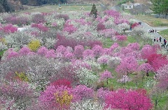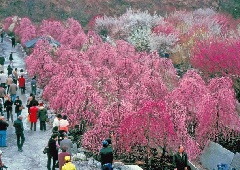 鈴鹿山脈を一望できるいなべ市農場公園の梅林公園エリアには、東海地区最大級の梅林があり、例年2月下旬から3月下旬にかけて、約38haもの敷地に、芳香とともに濃淡の紅色の花が咲き誇ります。特に、一つの花に紅白2色の花をつける珍しい品種の「思いのまま」は必見です。開花時期には「梅まつり」が開催され、飲食やお土産などの販売、猿まわし、大道芸によるイベントや、うまいもん市が行われます。