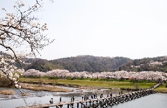 開花時期の異なる桜が、春先の雲南市を彩り、およそ2か月にわたり「桜まつり」が開催されます。木次町では、「日本さくら名所100選」に選定された斐伊川堤防桜並木に、約800本の桜が咲き誇り、2kmにわたって続くさくらのトンネルが現れます。期間中は、ぼんぼりが灯り、ライトアップされた夜桜が楽しめます。三刀屋町では、例年4月中旬から下旬にかけて、珍しい黄緑色の桜「御衣黄(ぎょいこう)」が見頃を迎えます。
