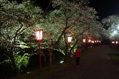 JRえびの飯野駅の北東にある標高400mの八幡丘山頂と、その周辺に整備された八幡丘公園は、市内でも随一の桜の名所として知られます。ソメイヨシノなど650本が咲き誇り、山頂まで続く並木道を桜のトンネルが美しく飾ります。桜並木は見頃にあわせてライトアップされ、幻想的な夜桜が楽しめます。