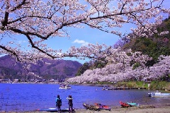 海津大崎は、「日本のさくら名所100選」にも選ばれている、近畿圏では遅咲きの桜の名所です。琵琶湖岸約4kmにわたって、樹齢80年を超える老桜から若木まで、ソメイヨシノ約800本の桜並木が続きます。満開時には桜のトンネルを楽しむことができるとあって、多くの花見客で賑わいます。