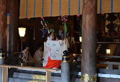 三嶋大社の桃節句祭では、神饌(しんせん)によもぎの菱餅や、桃の花を添えた神酒が献上されます。普段の榊に代え、紅白の桃の枝を用いて、八乙女舞が奉納されます。三嶋大社は、源頼朝が源氏再興を祈願した古社として知られ、5万平方mの神域には、重要文化財に指定されている本殿、幣殿、拝殿や、三嶋大社の歴史と資料を展示する宝物館があります。