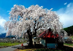 桜巡礼の里として知られる信州高山村には、水中のしだれ桜、赤和観音のしだれ桜、黒部のエドヒガン桜、坪井のしだれ桜、中塩のしだれ桜が集落に点在し、「信州高山五大桜」と称されます。約20本のしだれ桜の半数は樹齢200年を超す老樹で、いずれも巡礼するにふさわしい見事な枝ぶりに花を咲かせます。松川沿いのオオヤマ桜も美しく見応えがあり、春の山里の雰囲気を味わいながら花見を楽しめます。