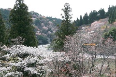 宮崎市中心部から青島へ続く、県道377号線を南下すると、山肌に植栽されたヤマザクラが姿を現します。満開になると、辺り一面が桜色に包まれます。峠を越えた先は、太平洋の水平線を一望できる日南海岸へとつながり、道の駅もあります。