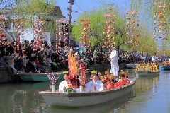 健やかな子どもたちの成長を願う、手作りの「さげもん」が水上に飾られ、雅楽の音色が響く中、お内裏様とお雛様、かわいい稚児たちによる華やかな水上パレードが行われます。柳川の初節句の様子が窺える、「柳川雛祭りさげもんめぐり」の見どころのひとつとなっています。「さげもん」は、柳川に古くから伝わる風習で、女の子が生まれると、初節句のお祝いに、祖母や親戚たちが一針、一針縫い上げたものが、雛壇の両脇に飾られます。
