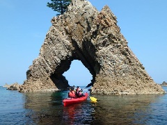 網代港からスタートし、浦富海岸の西側に位置する景色豊かな海を、シーカヤックで周遊します。インストラクターの丁寧な指導で、子どもから大人まで男女問わず、初心者でも楽しめます。海側から望む山陰海岸ジオパークの地層が重なり合った美しい景色は、一見の価値があります。このほか、船底まで透明なクリアカヤックの体験や、シュノーケル体験などのプログラムもあります。※濡れてもよい服装、帽子、マリンシューズ、手袋、日焼け止め、飲み物などを持参してください。渚交流館まで/JR岩美駅から「田後・陸上行」の町営バス「海と大地の自然館」~徒歩1分