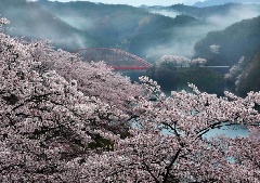 青蓮寺湖の周辺約5kmの道路沿いに植えられた約600本の桜が、例年3月下旬から咲き始め、4月上旬に見頃を迎えます。周りを山々に囲まれた青い湖面に映える桜が美しく、特に青蓮寺ダムえん堤を望む展望台駐車場までは、山一面がピンク色に染まります。湖畔周辺ではバードウォッチングなどが楽しめるほか、公園やテニスコートなどがあります。青蓮寺湖観光村では、例年1月上旬から5月下旬までいちご狩りができます(有料)。