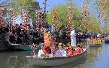 豊作を祈願し、海津阿蘇神社で御田植祭が行われます。朝鮮の役に出兵した柳川藩の家老小野和泉守が、阿蘇神社(古川の早鷹)にお礼言上の参拝をし、その後、元和8年(1622年)に現在の地に社殿ならびに神田を献納して感謝の辞を捧げ、豊作祈願のために御田植祭が興ったとされます。座元と呼ばれる氏子の家から神社までを行進する行列が見どころとなっています。神社の境内では、初春からの心構えに始まり、耕地、種まき、苗作り、田植えと続き、秋の収穫までの様子を、神主や田打男、早乙女などが独自の掛け合いの田植え歌を交えながら奉納します。みやま市の無形民俗文化財に指定されています。