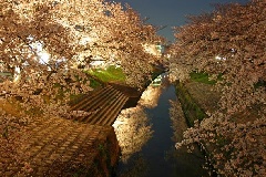 高田川畔の千本桜は、市制施行の昭和23年(1948年)に市民ボランティアの手によって植樹されたもので、「高田千本桜」として親しまれています。例年3月下旬から4月上旬にかけて、大中公園を中心に川の両岸南北2.5kmにわたり、見事な桜のトンネルが続きます。夜になると、夕闇のなか、ぼんやりとライトアップされた幻想的な夜桜を観賞することができ、奈良県を代表する花見の名所のひとつとなっています。