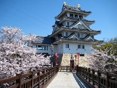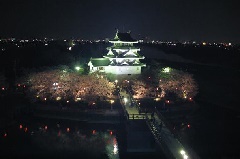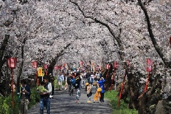 犀川堤の約3.7kmにわたって続く、約750本の桜が見頃を迎えます。ぼんぼりが立ち並ぶ桜並木を抜けると、墨俣一夜城(大垣市墨俣歴史資料館)があり、最上階からは綺麗な景色を望めます。夜間はライトアップが行われ、一夜城をバックに幻想的な夜桜を堪能することもできます。