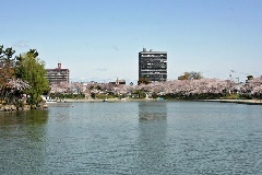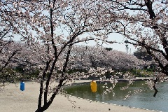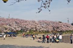 「日本の歴史公園100選」に選定され、春から初夏にかけて藤やツツジ、秋には彼岸花なども楽しめる天王川公園では、ソメイヨシノ210本、しだれ桜6本、神代曙8本など合わせて248本の桜が咲き誇ります。花見の時期には屋台が並ぶほか、提灯による夜間照明が行われます。丸池を取り囲むように生い茂るソメイヨシノが重なり桜並木となって、公園を訪れる人々を出迎えます。