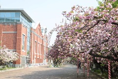 「さくら名所100選の地」に選定されている造幣局で、毎年4月上旬から中旬の1週間に「桜の通り抜け」が開催されます。造幣局南門(天満橋側)から北門(桜宮橋側)への一方通行で、約560mの桜並木が楽しめます。敷地内には、関山(かんざん)や普賢象(ふげんぞう)、松月(しょうげつ)など、約140種類、340本の桜が植えられています。