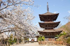 前山寺境内が、例年4月上旬から中旬にかけて、シダレ桜、ソメイヨシノ、山桜などで彩られます。「未完成の完成塔」と称される三重塔は、室町時代の建立で、国の重要文化財に指定されています。前山寺は、信州の鎌倉と呼ばれる塩田平の独鈷(とっこ)山麓にある古刹で、空海による開山と伝わります。