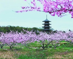 備中国分寺周辺には栽培農家が運営する桃園があり、例年4月上旬になるとピンク色の美しい花を咲かせます。吉備路のシンボル、備中国分寺の五重塔とのコントラストは、歴史ロマン漂う日本の風景そのもので、カメラマンに人気の撮影スポットとなっています。周辺には20kmのサイクリングロードが整備され、花を愛でながらサイクリングやウォーキングも楽しめます。