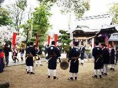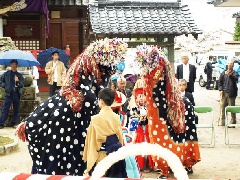 曽根崎町老松神社において、鉦(かね)と太鼓による調子にあわせて、獅子舞が披露されます。雄獅子、雌獅子、つり合い獅子の順序で演じられ、雄、雌獅子とも前獅子役と後獅子役があり、童子の獅子つりにつられるように舞う様子を見ることができます。老松神社の神幸祭として行われ、土地の悪霊を鎮めて人々を浄め、豊作が祈願されます。