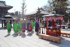 お釈迦さまの誕生を奉祝する4月8日の「花まつり」に際し、川崎大師では毎年4月1日から8日までを「花まつり週間」として、花御堂に安置した誕生仏に甘茶を灌ぎ、参拝者とともにお祝いします。期間中は、参詣者に甘茶がふるまわれるほか、1日と8日は花御堂にて法楽が行われます。※状況により、行事内容が変更または中止となる場合あり
