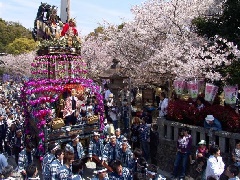 遠州地方に春の訪れを告げる三熊野神社大祭は、享保の頃、第14代横須賀城主の西尾隠岐守尚(にしおおきのかみただなお)が当時の江戸天下祭(神田・山王両祭礼)の文化をこの地方に伝えて以来、200年以上にわたって受け継がれてきた伝統ある祭りです。満開の桜の下、神輿の渡御とそのお供に従う華やかな13基の祢里(ねり)の曳き廻しが見どころで、「シタッ!、シタッ!」の掛け声とともに横須賀地区を威勢よく巡行する勇壮で華麗な姿は、見るものを圧倒します。祭りで披露される「三社祭礼囃子」、「地固め舞」、「田遊びの舞」は県の無形民俗文化財に指定されています。