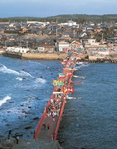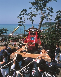 地元の人が“神の島”と崇める「雄島」に、1300年以上も前から鎮座する「大湊神社」の祭礼の一つです。海に出た父や夫、兄弟の無事を祈って、神輿を神社に奉納したのが始まりとされ、1000年以上も地元住民により受け継がれています。毎年4月20日に、安島地区から東尋坊を舞台に営まれ、なかでも、女性が担ぐ「乙女神輿」が海上の伝馬船から、男衆が担ぐ「船神輿」が東尋坊の断崖から、年に一度の逢瀬を楽しむ場面は必見です。地元青年団による神事や、男衆が神輿を担いだまま海を渡る迫力満点の「船神輿の海渡り」は見応えがあります。