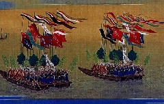 美保神社の祭神が国譲りを決めた後、自ら海中に青い柴垣を作り、お隠れになったという神話に基づく「青柴垣神事」が行われます。1年間、物忌潔斎(ものいみけっさい)したその年の當屋(とうや)を、青柴垣を飾った2隻の船に乗せ、同神社に戻り参拝し、奉幣します。