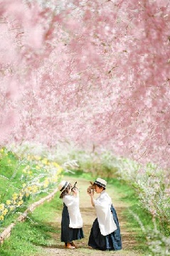 世羅高原農場の3万平方mの丘に、シダレザクラを中心とした桜が、例年3月下旬から4月上旬にかけて咲き誇ります。園内に入ると、空を覆うほどのシダレザクラがのれんのように来場者を迎えます。春の観光農園にふさわしく、菜の花やヒヤシンスなど、多様な春の花々と桜のコラボレーションを楽しめるのが魅力です。夜桜のライトアップも予定されています。
