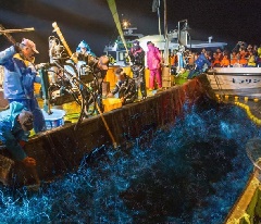 国指定特別天然記念物「ホタルイカ群遊海面」として有名な滑川の沖合で、「滑川ほたるいか海上観光」が行われます。春を告げる富山湾の神秘の生き物「ホタルイカ」は、シーズンになると産卵のため、深海から海岸近くまで押し寄せます。早朝に出港する観覧船から、漁師たちが定置網でホタルイカを獲る様子を見学できます。幻想的にきらめくホタルイカの青白い光や伝統的な“ホタルイカ漁”など、普段見ることができない貴重な体験ができます。※乗船には予約が必要(未就学児は乗船不可)