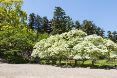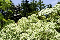「なんじゃもんじゃ」の別名で知られるヒトツバタゴが、例年5月上旬になると、松江城山公園を彩ります。高さ15mくらいになる落葉樹で、木を覆うように真っ白な花を咲かせ、まるで初夏に雪が降ったかのような風情ある光景をつくります。開花すると10日ほどで散ってしまう、見頃が非常に短い花です。